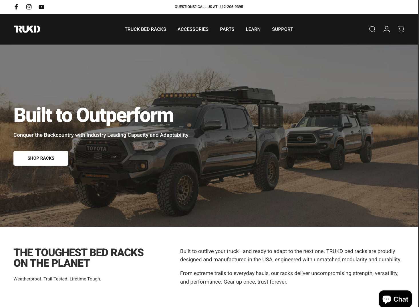 FLYTSITES rebuilt the Shopify experience with clearer education, improved product logic, stronger SEO structure, and a streamlined path to configure racks and add accessories. The new site positioned TRUKD as a premium, intuitive, and trustworthy overland brand.